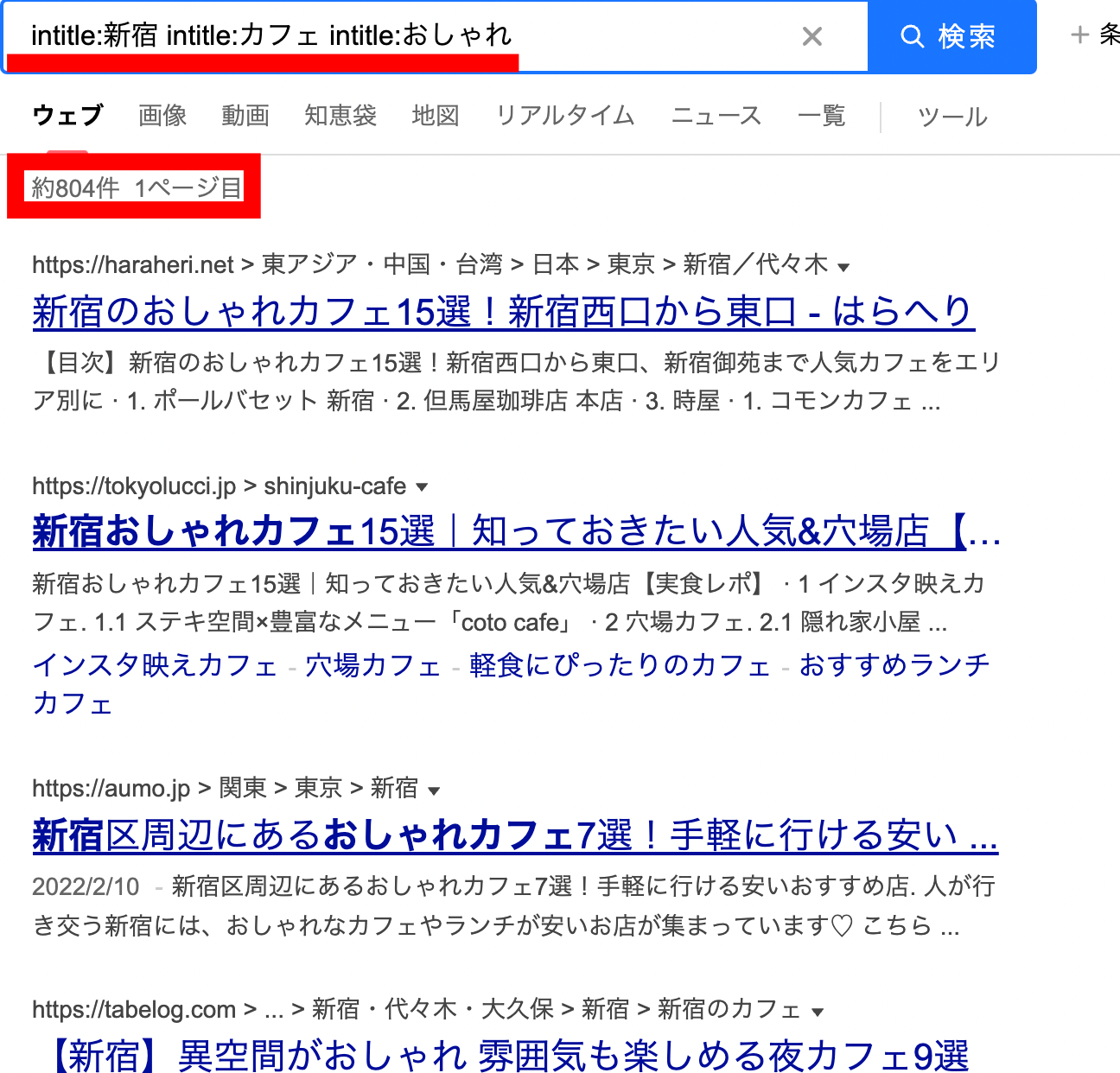 他にも実例を紹介すると、「新宿 カフェ おしゃれ」と検索したときに、そのキーワードが含まれているタイトルを見ると、合計で「804件」あるのに対し、