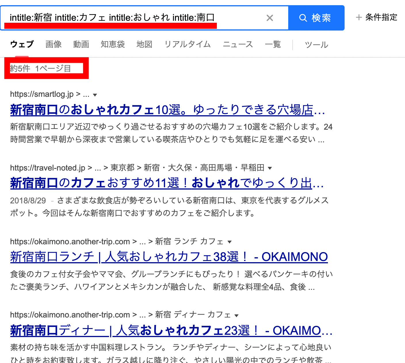 「新宿 カフェ おしゃれ 南口」と関連キーワードをもう一つ増やすことによって、そのキーワードを含むタイトルのサイトは「5件」と一気に少なくなりましたね。